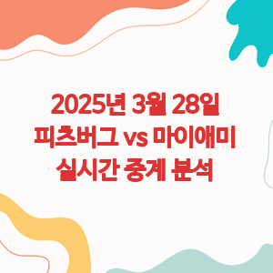 2025년 3월 28일 오후 7시 10분(한국시간 오전 9시 10분)에 피츠버그 PNC 파크에서 피츠버그 파이리츠와 마이애미 말린스의 개막전 경기가 펼쳐질 예정입니다. 이 경기는 국내에서 SPOTV를 통해 실시간 중계될 예정이며, 주요 온라인 스포츠 중계 사이트에서도 시청할 수 있습니다.
